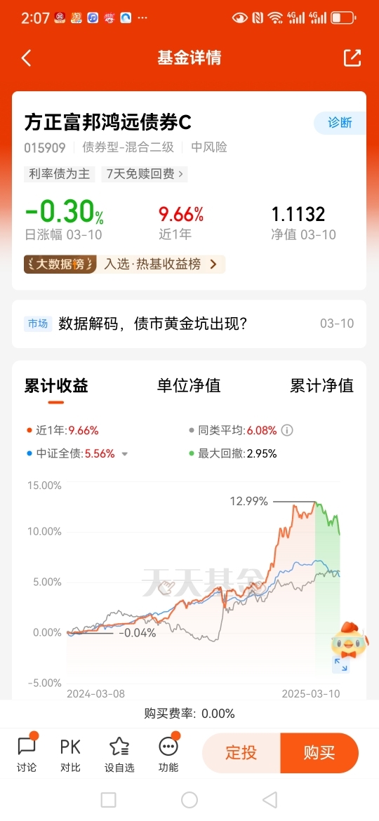 衡量债基的专业指标很多,对于我们普通投资者而言太过于专业,我们也没有时间和精力去研究和分析那些专业指标,不如简简单单的按照限购和分红来选择一款好的债基!$方正富邦鸿远债券C$就是一款好的债基,去年涨幅惊人,可以重点关注。