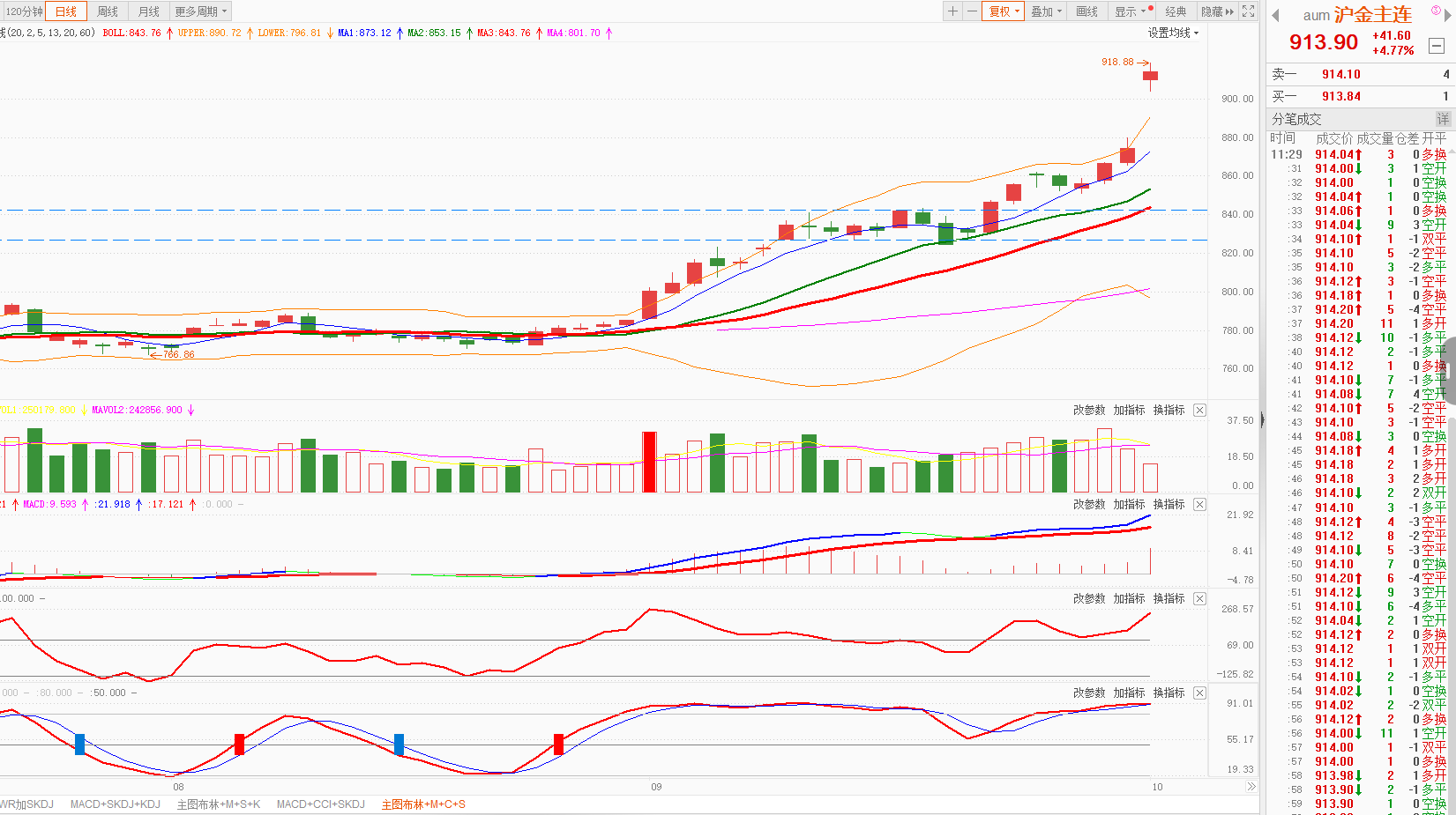 沪金主连:涨4.77%,日K线在5日均线之上。由于节日休市,今天沪金开盘跳空大涨,日K线在布林线上轨之上,上升动能较强,由于美元信用问题和各国央行持续大幅增持等因素,后市可能继续上行。但目前也不宜追高,错过了买点,最好等下一次,毕竟如被套在高点,会影响情绪。