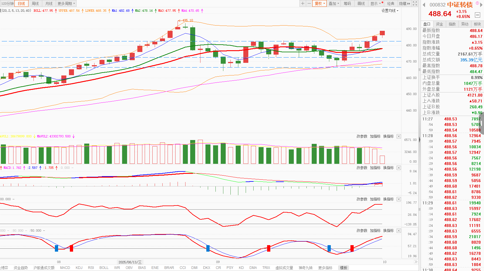 中证转债:涨0.65%,日K线在5日均线之上,KDJ金叉,MACD金叉红柱放大。今天中证转债继续上涨,日K线站上布林线上轨 ,5日均线向上,上升势头较好,后市可能继续震荡上行。