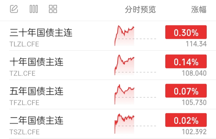 今天2、5、10年国债期货日K线收盘后在5、10、20日均线之上,30年国债期货日K线收盘后在5日均线之上,10、20日均线之下,整体低开高走,走势较强。