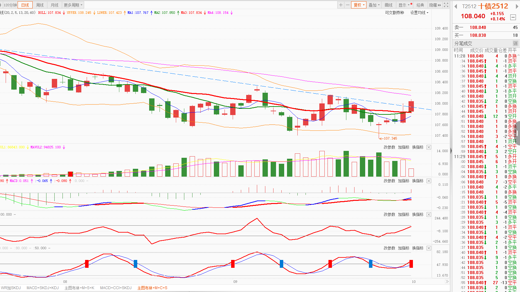 今天10年国债期货小幅低开后高走,涨0.14%,日K线在5、10、20日均线之上。