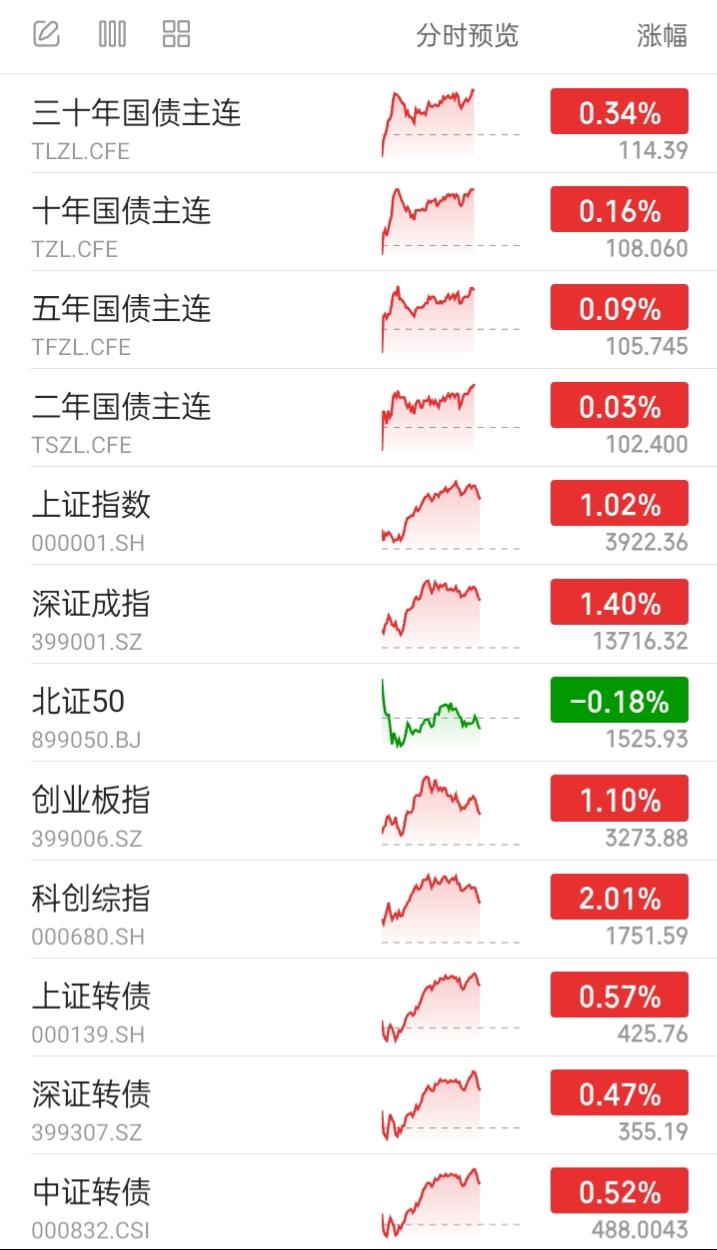 下午国债期货先下后上。目前全部上涨。