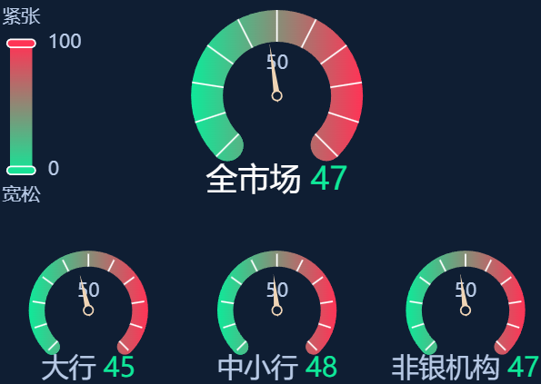 五、资金面情绪指数:全市场47 资金面偏松 (0-100紧张度递增,50为均衡,超过50反映资金紧张)