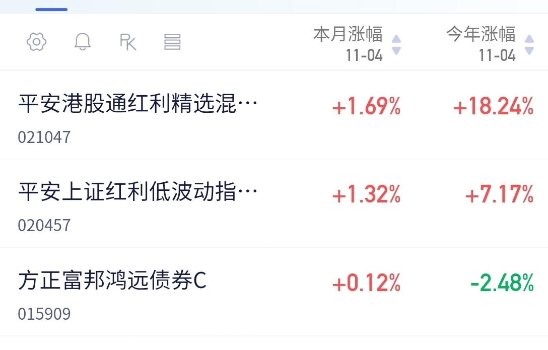 在当前市场波动加剧、资金偏好防御的行情下,$平安港股通红利精选混合发起式C$ 今年涨幅18.24%,利用港股低估值优势,提供额外分红收益和估值修复潜力,增强整体收益弹性。$平安上证红利低波动指数C$ 锚定A股高分红、低波动个股,防御性突出,能有效平滑组合波动,今年涨幅7.17%,追求稳健回报。$方正富邦鸿远债券C$ 回撤2.48%,加油。