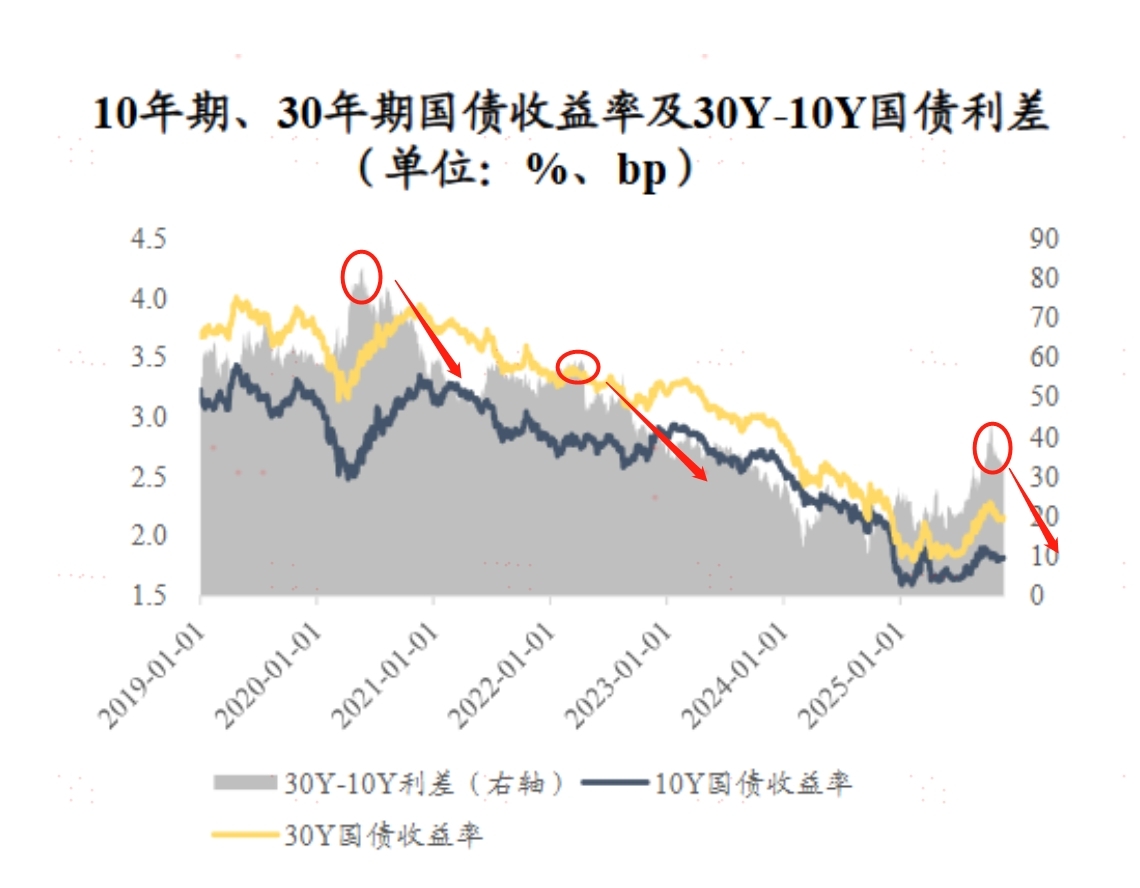 看利差就知道,利差到相对高点就会往下,现在30-10的利差已经是40个BP往上了