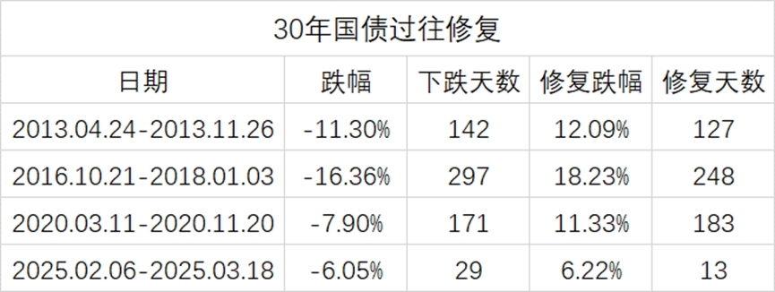 查了一下30年债的历史情况,有几次调整时间和这次一样,都是比较长时间的调整,看后面的修复状态,又是在更短的时间里就完成了修复,而且还创出了新高。
