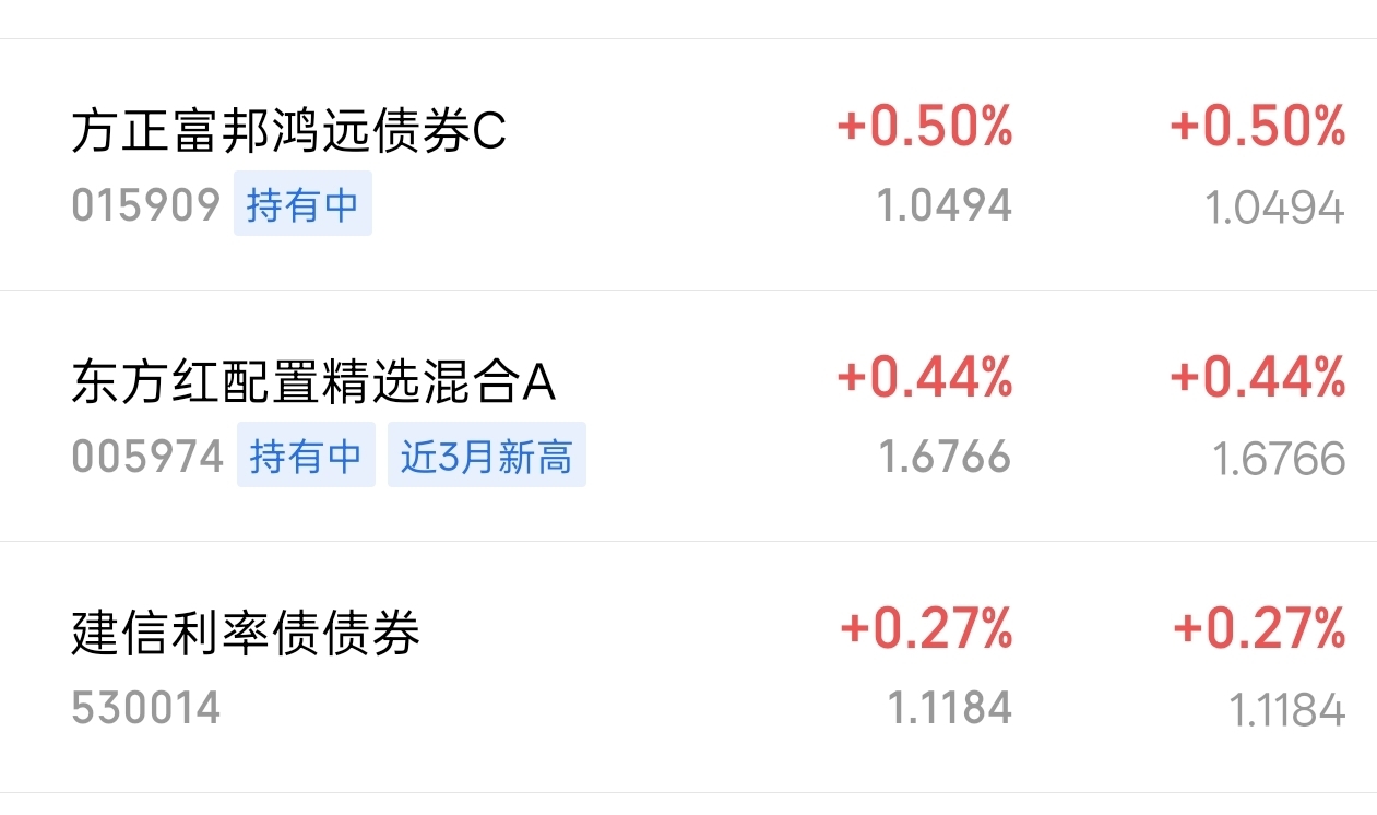 今天债市在震荡中偏强运行,利率债小幅走牛,信用债表现平稳。鸿远又准时送来50个蛋,三天累计已超130;其他几只债基也陆续更新,有的收了二十来个,有的十来个,整体账户稳稳向上。