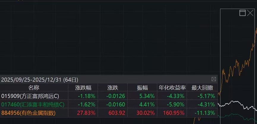 我感觉方正是9月份加的,看了看他和丰和还有有色的走势,感觉就是9月份开始加,但是一开始可能很少,其实现在3个点也不多,不过能看出来按理来说差不多的久期确实是比丰和要好一些,少了一些蛋,这个应该就是有色金属的功劳。