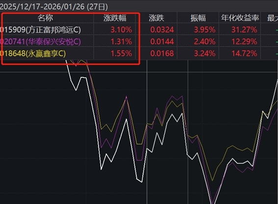 近期不同产品间收益差异有所扩大,鸿'子的表现相对突出,不仅弥补了前期回撤,还展现出一定的上涨动能。$永赢鑫享混合C$ $华泰保兴安悦债券C$