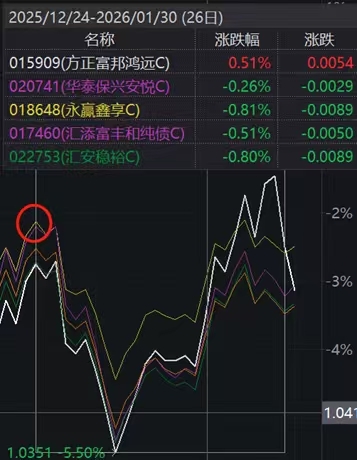 多少兄弟在图里高点进的,经历一月初跌,前天跑路。为啥能跑?不就是涨回来了。没这策略,按久期算还少80多个蛋,这一来一回差了130多个。前两天虽有波动,但拿业绩说话,比纯蹲超长债强,纯债收益天花板低。这策略弹性足,收益确实提上来了。