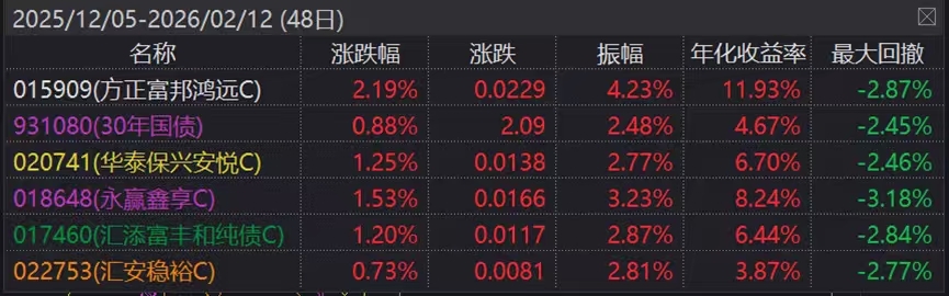 虽然今天股市这边又弱了,但我翻了下近两个多月的业绩表现,比30年国债多赚了1.3