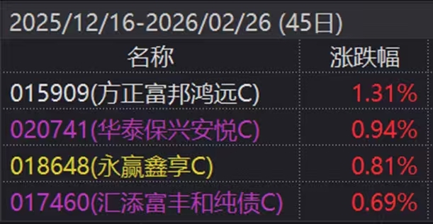 鸿子组合里,利率债是盾、有色金属是矛。这几天利率债波动大,更显带股的优势,长债表现一般,有色却扛住了大旗。要的就是攻守兼备,近一周鸿子久期虽长,靠股票表现更优。$华泰保兴安悦债券C$ $汇添富丰和纯债C$