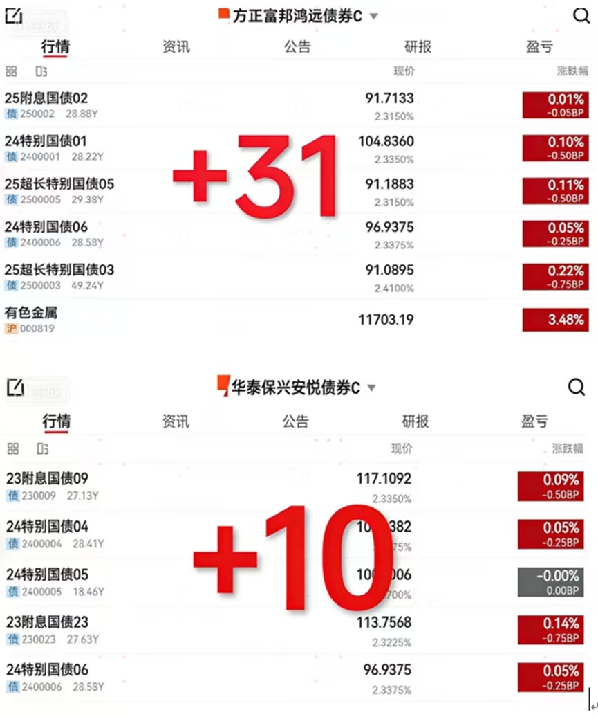 今日股债齐涨,鸿子利率+单日涨幅是30年国债的好几倍!超长债打底+精选股票增强,
