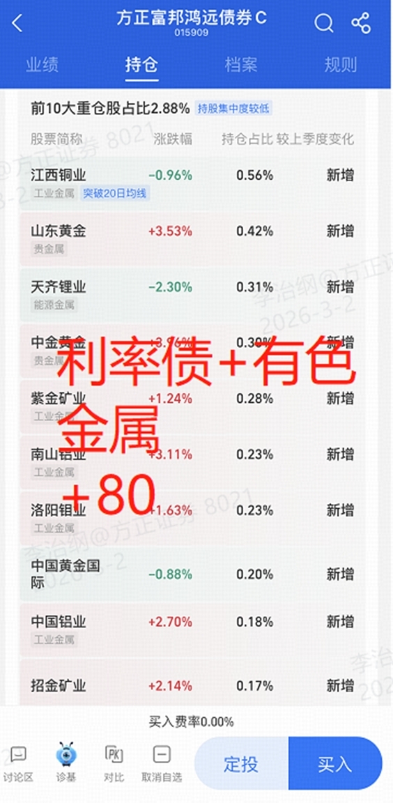当市场调整时,资金往哪儿跑?一个是国债,一个是贵金属。所以按照这种逻辑,鸿远后面应该吃肉的机会很大。现在就是利率债+贵金属的双重配置,应该比单一纯债后面收蛋要多了。