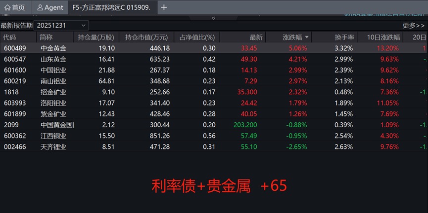 现在美伊冲突持续,贵金属避险属性凸显。鸿子在利率债底仓之外,还提前配置了贵金属相关资产,现在正是地缘紧张时,贵金属避险属性凸显,鸿子今天有机会收个大蛋了。