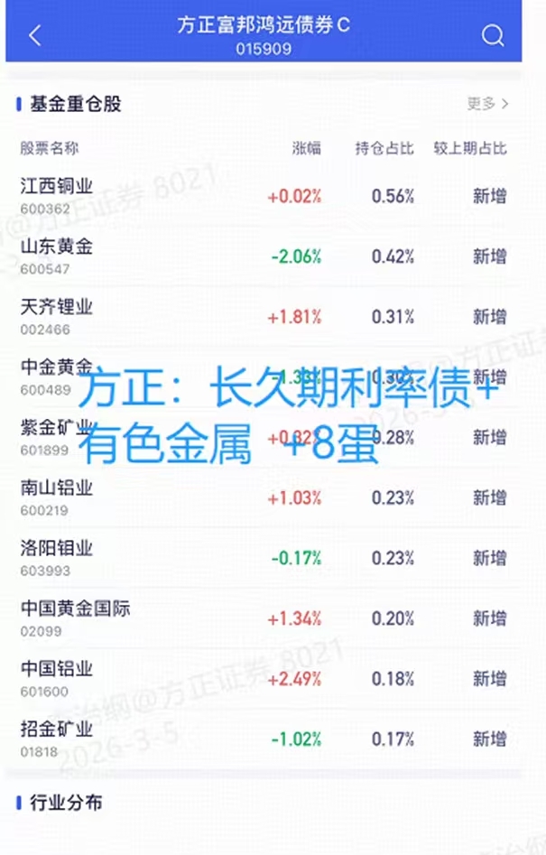 这几天的市场真是波动不小,直白说经过去年一年的洗礼,让我明白单一资产永远无法应对所有市场环境。今天股市上涨之后债也是震荡调整,还是出现了股债翘板效应。目前看因为持仓里不仅有利率债,还有有色金属,所以涨的会比同类型的有弹性,目前大概8个蛋左右,其他的也就1-2个蛋吧。近三个月业绩鸿子也好一些,有个30-40个蛋的超蛋吧。