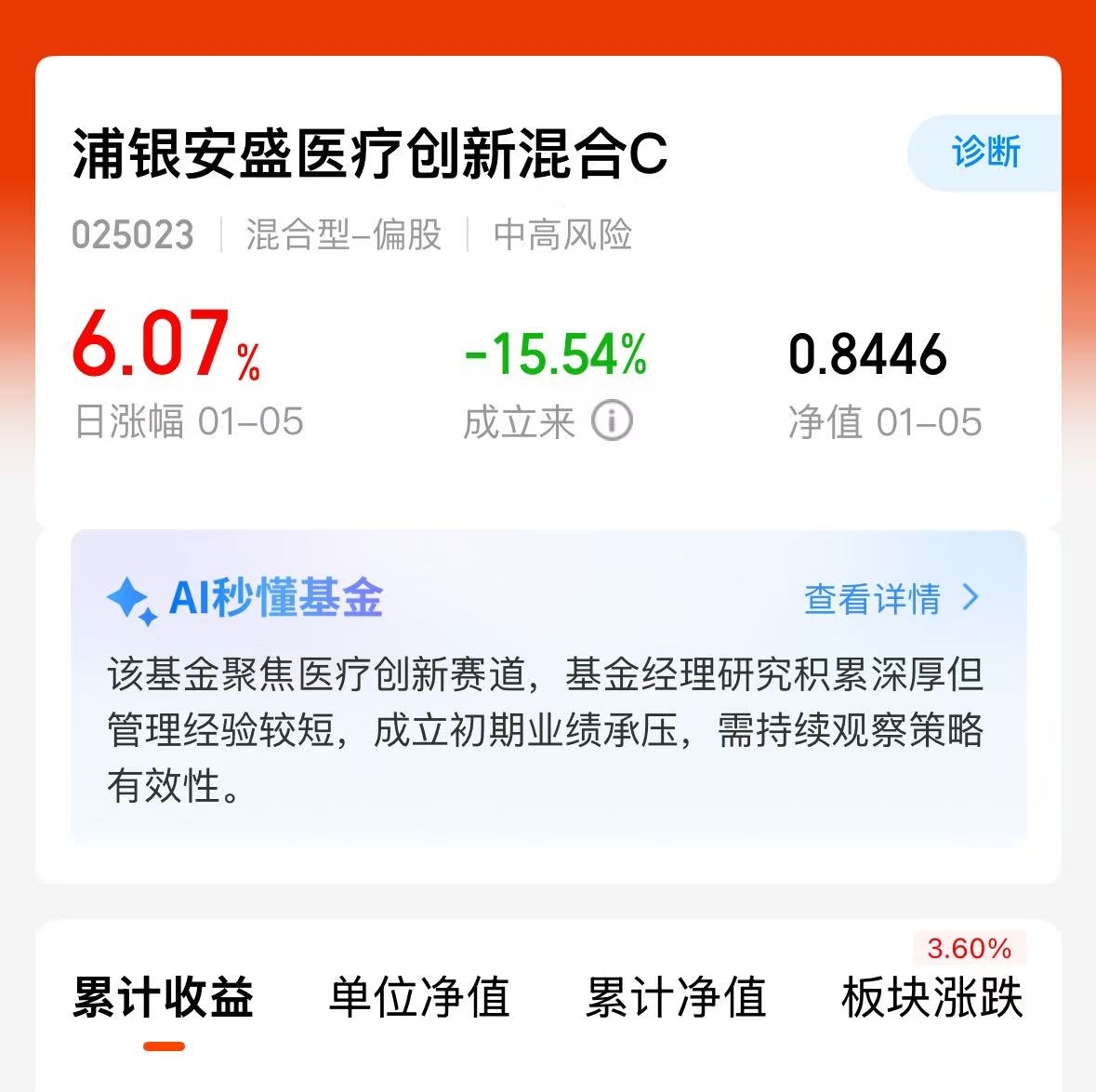 浦银安盛医疗创新当日大涨6.07%,属实反弹拉升了啊,新年开门红,跟紧节奏定投一