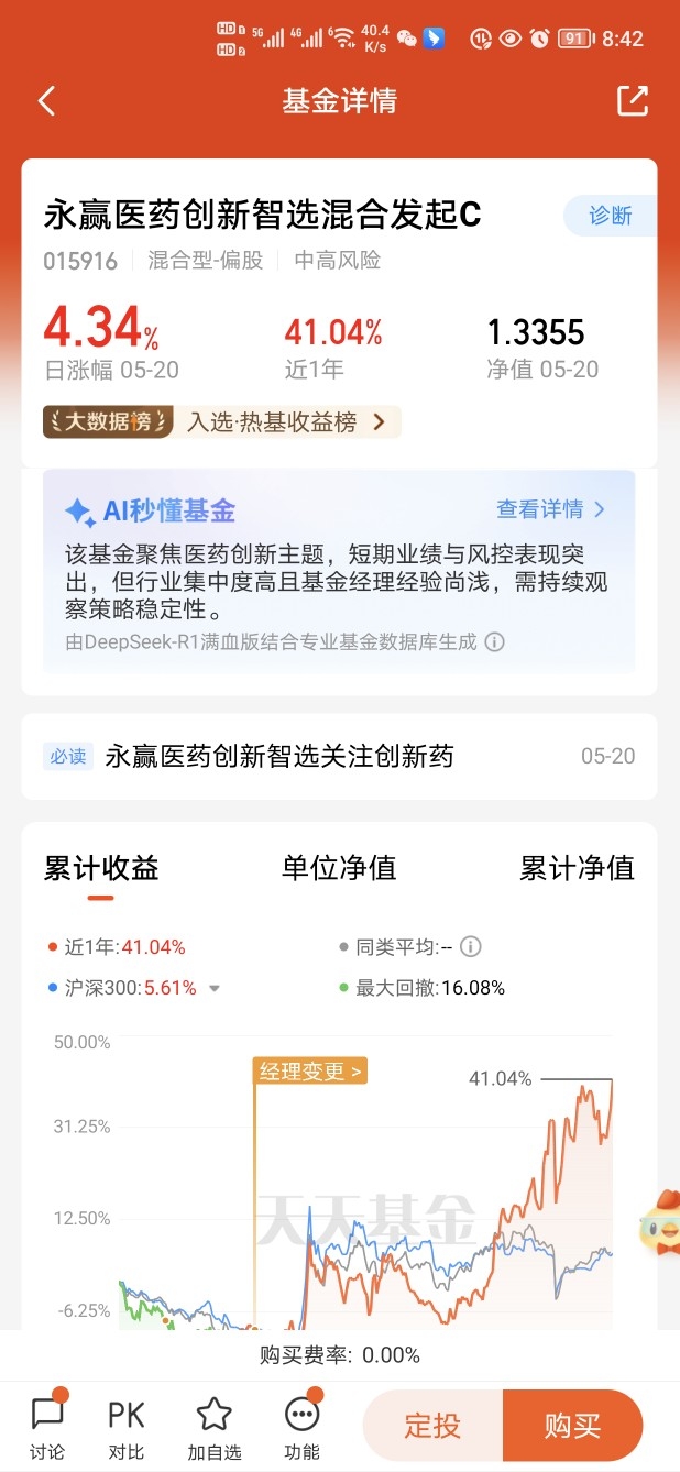 已经连续上涨三天了,真的还是挺给力的呀,$永赢医药创新智选混合发起C$ 今天的涨幅超过四个点。这个产品聚焦港股+A股创新药,覆盖创新药、CRO、医疗器械等高景气赛道。它成长弹性凸显,表现非常给力,多个阶段排名同类优秀,当前政策、技术、需求三重共振,而创新药仍处于低估值区域之际,后续大概率会继续上涨,上涨空间我认为还非常高。
