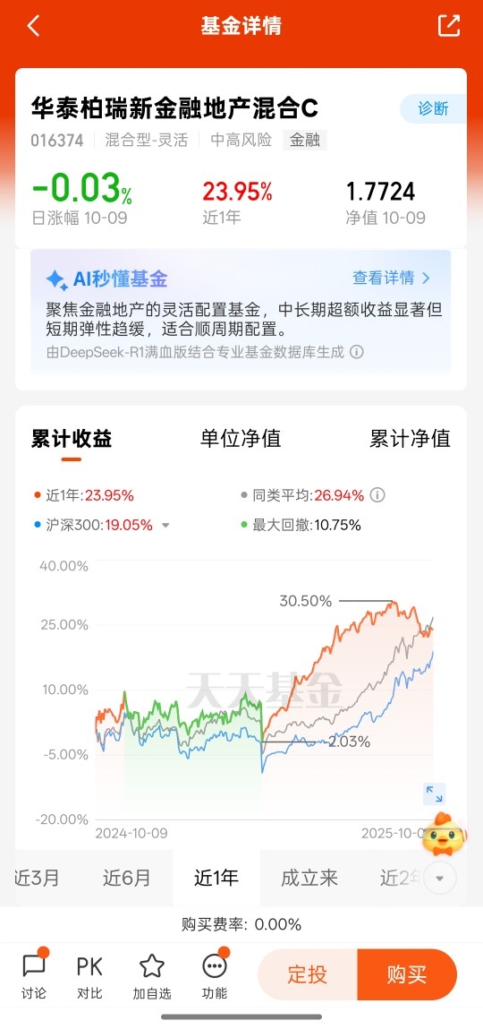 今天打开账户心都凉了半截,科技股跌得那叫一个惨!你看现在金融地产板块,虽然昨天稍微跌了一点点,但政策面一直在发力,央行都表态要稳楼市,后面肯定有戏。这种顺周期的行情里,华泰柏瑞就很合适,它专门盯着金融地产这块,风格稳,中长期表现也靠谱,拿来平衡一下科技股的风险,心里踏实多了。