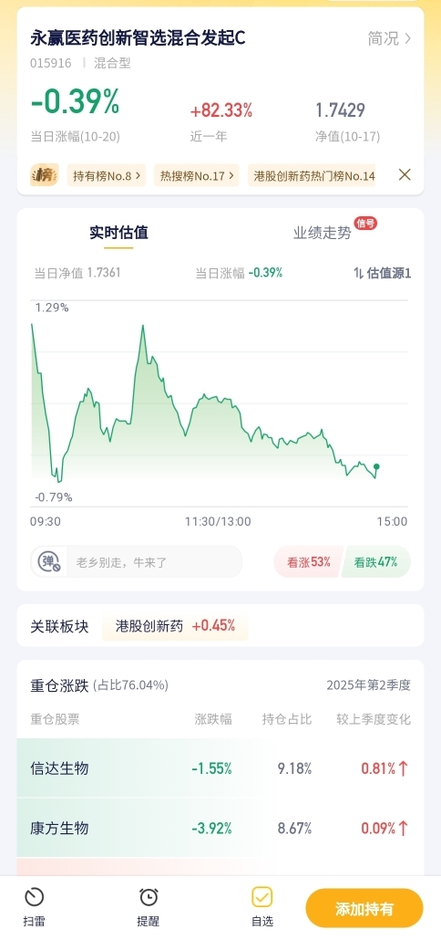 今天这基金跌了点,医药板块没太发力,可能是短期情绪影响,资金没大量流入,所以它也跟着小跌。