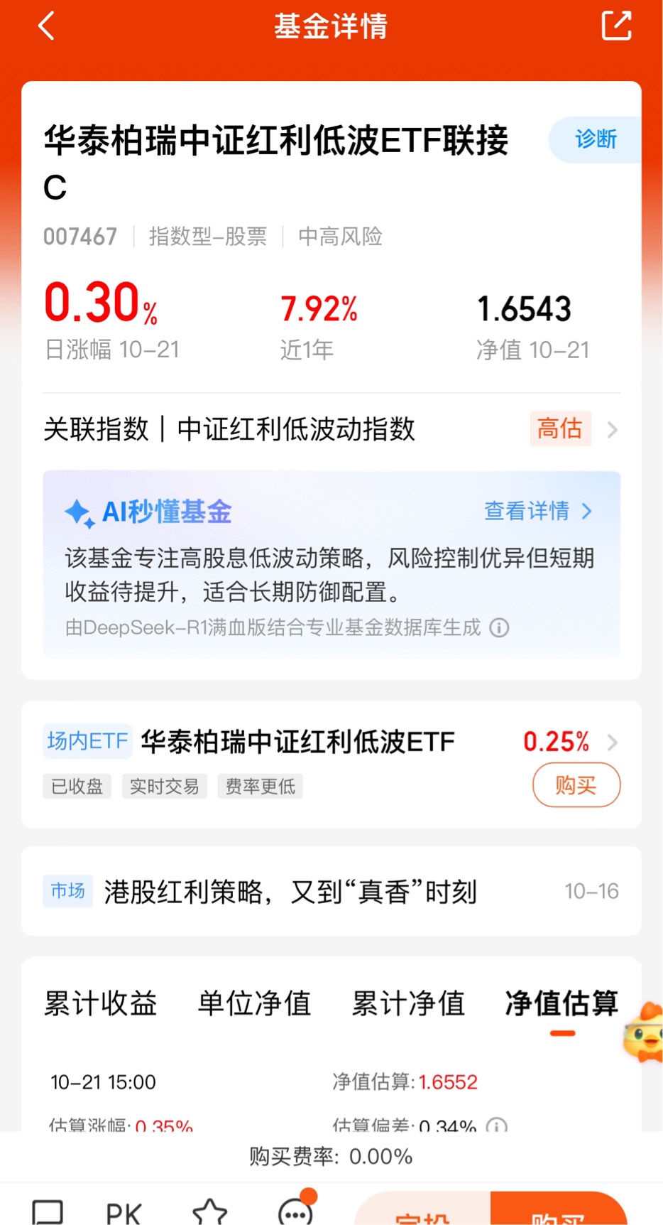 最近市场波动跟坐过山车似的,不少人都愁得慌!但你知道不,“红利低波”今天可是挺给力的。这时候咱就得想想,把部分仓位调到红利防御板块,那心里能踏实不少。要知道以往四季度,红利低波类的表现经常能跑赢沪深300呢。那咱就说说华泰柏瑞的红利低波ETF联接C,它就挺适合在这种波动市场里当个“稳定器”,想布局的朋友可以多留意留意。$华泰柏瑞中证红利低波ETF联接C$