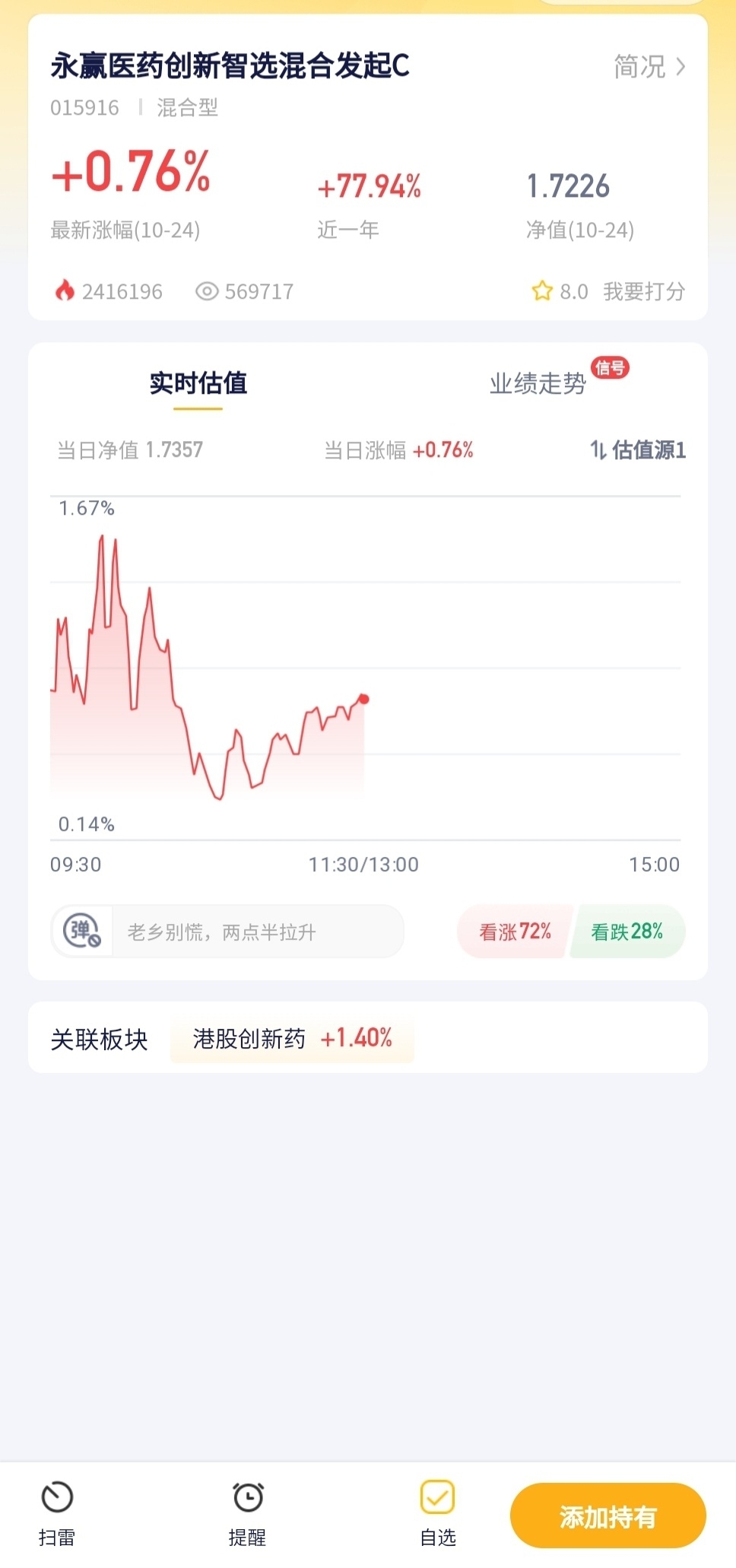 医药板块今天小涨,这只基金跟着涨了点,医药投资者今天能喝口汤。