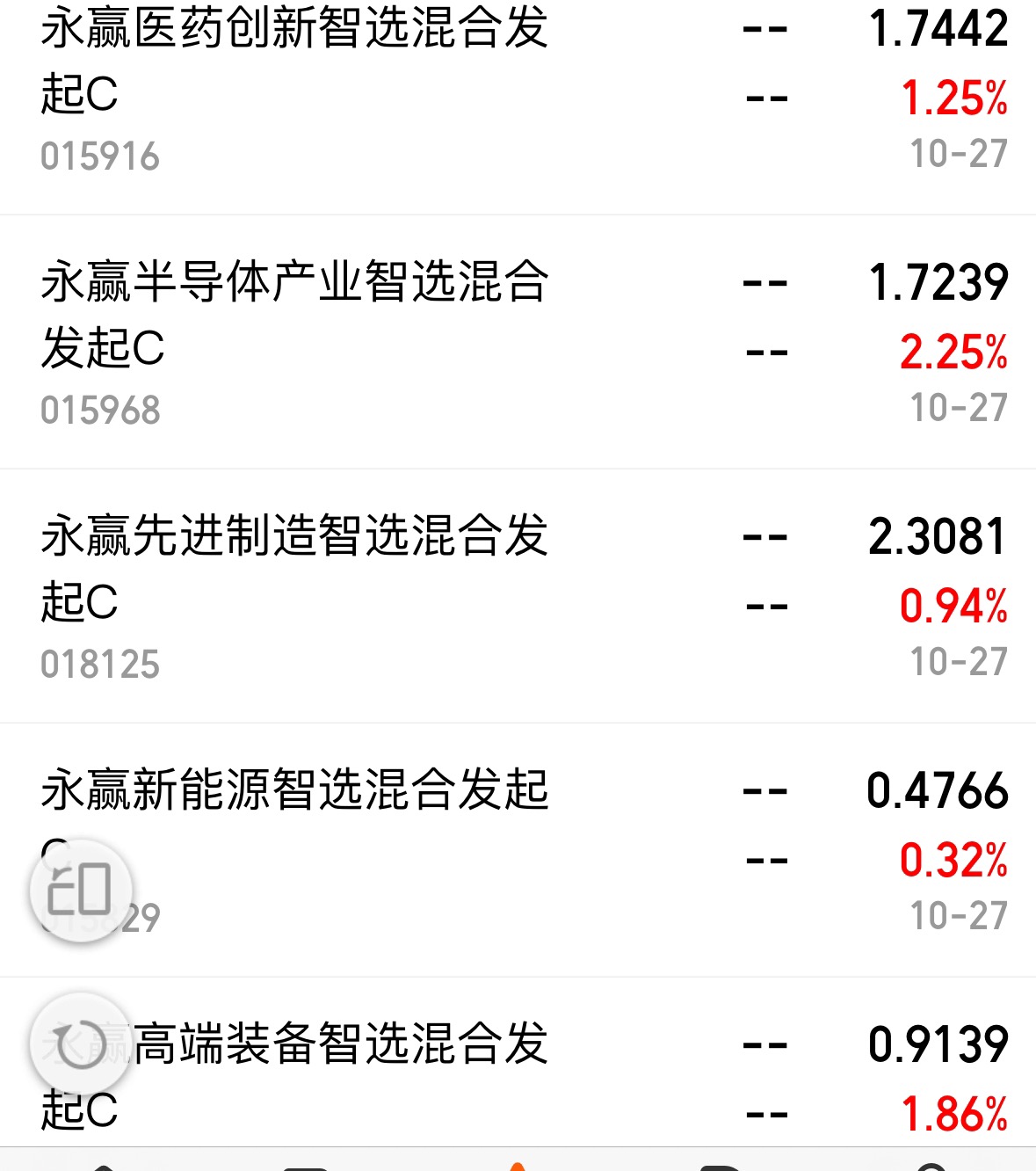 看看永赢家族今天整体走势:最近都是可以加仓起来了$永赢医药创新智选混合发起C$ 医药创新收1.25%,近6个月收33.57%,表现优秀。$永赢新能源智选混合发起C$ 新能源收0.32%近3个月收24.80%表现不错。$永赢高端装备智选混合发起C$ 高端制造收1.86%近3个月收13.26%还有发展空间。从各个阶段来看这些还是比较给力的,产品有医疗创新,机器人,新能源,光刻机等等!希望后面走势更好哈!这些基本都是潜力股呀,可以加关注起来了!