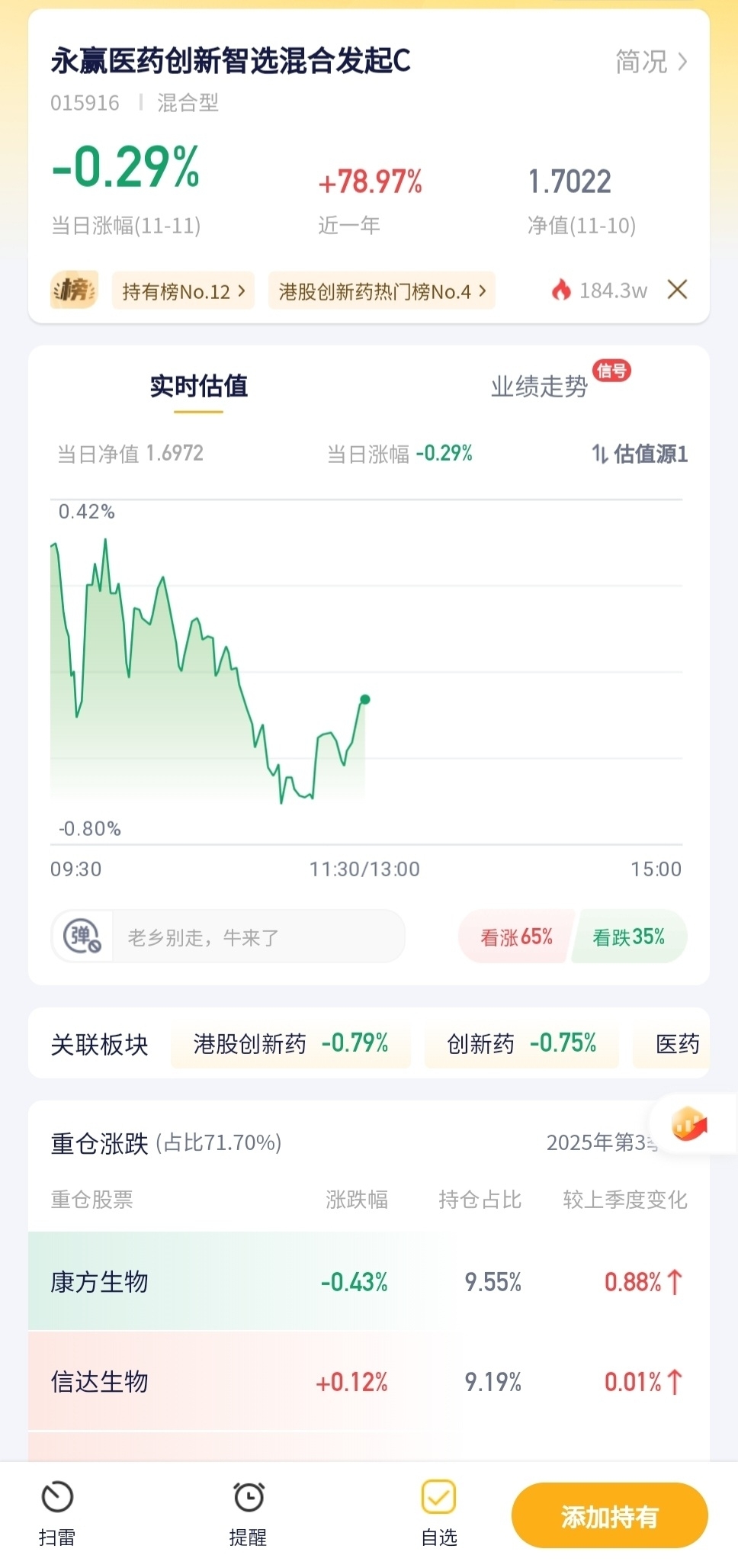 医药创新板块今天有点弱,这基金跟跌了近0.3%,不过医药长期看还有机会,先观察观察。