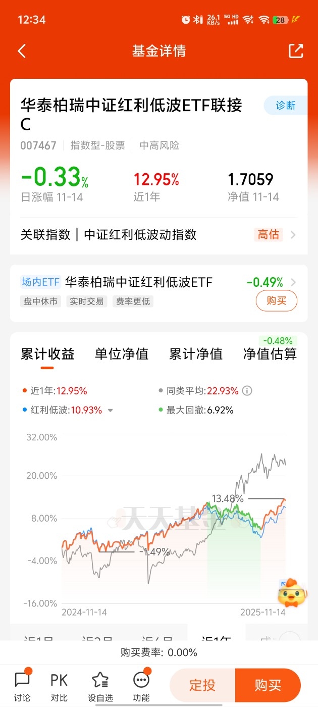 11月以来A股波动就没停过,主线切换快得让人摸不着头脑,追涨杀跌反而容易被套,不少人今年的收益都开始回撤了。这时候真得换个思路,四季度与其赌单一热门赛道,不如转到红利低波这种稳健板块求安心。今天红利低波板块继续保持韧性,高分红的优势越来越突出,不管市场怎么晃悠都能扛住,还能拿到稳定股息。我果断入手了华泰柏瑞,它家在红利领域布局久、规模大,选的标的都是经过市场检验的“现金牛”公司,用来守住今年的收益再合适不过,持有也放心。#科技热点摊开业啦# $华泰柏瑞中证红利低波ETF联接C$