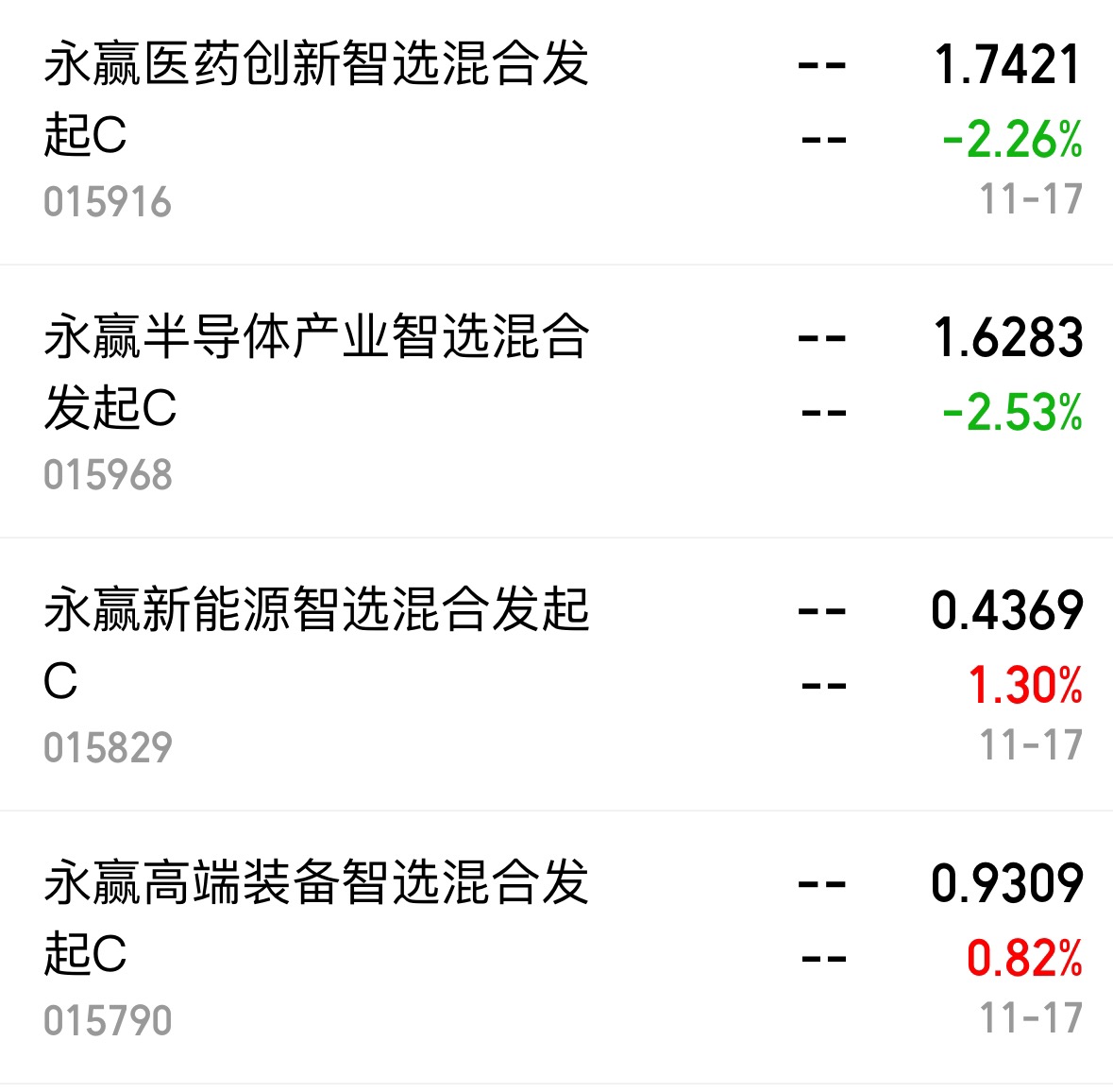 看看今天永赢智选系列的表现:$永赢新能源智选混合发起C$收1.30%,近6个月收