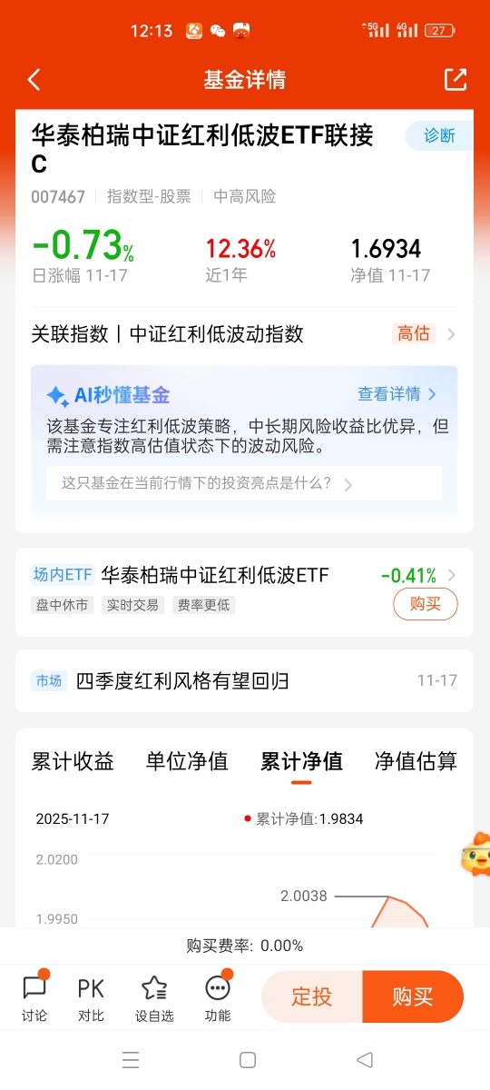 市场这波波动把人吓得不轻,之前追热点赚的那点钱,现在都悬着心。四季度了,得找个稳当的方式守住收益。华泰柏瑞的产品跟踪的是红利低波指数,这个指数的成分股分红稳定,波动也小,正好符合现在的需求,能让人把今年的收益保住。$华泰柏瑞中证红利低波ETF联接C$ #华为将发布AI领域的突破性技术#