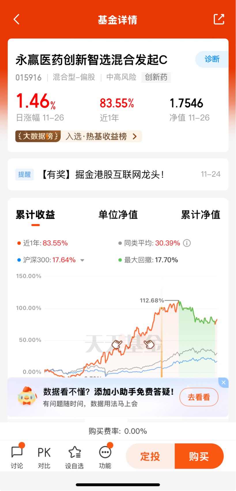 #流感药订单飙涨14倍 医药板块走强!# 随着人口老龄化加剧,慢性病、罕见病治疗需求增长,创新药渗透率提升空间大。$永赢医药创新智选混合发起C$ 昨天上涨1.46%,已经连涨3天趋势逐渐向好,近一周收益2.46%,近六个月收益34.09%,近一年收益83.55%,长期业绩优秀;创新药板块兼具政策红利、业绩拐点与国际化机遇,长期投资价值凸显,但需理性看待短期波动,把握结构性机会。