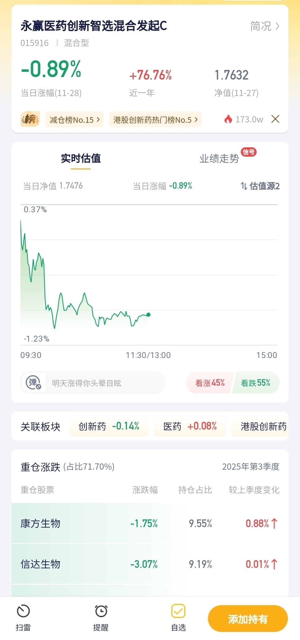 今天医药板块有点蔫,像创新药、中药都在跌,听说资金在从医药往科技那边挪,这基金重仓的是医药创新,正好撞上板块调整,今天就跟着跌了点,不过医药这赛道长期还能看,先拿着看看。
