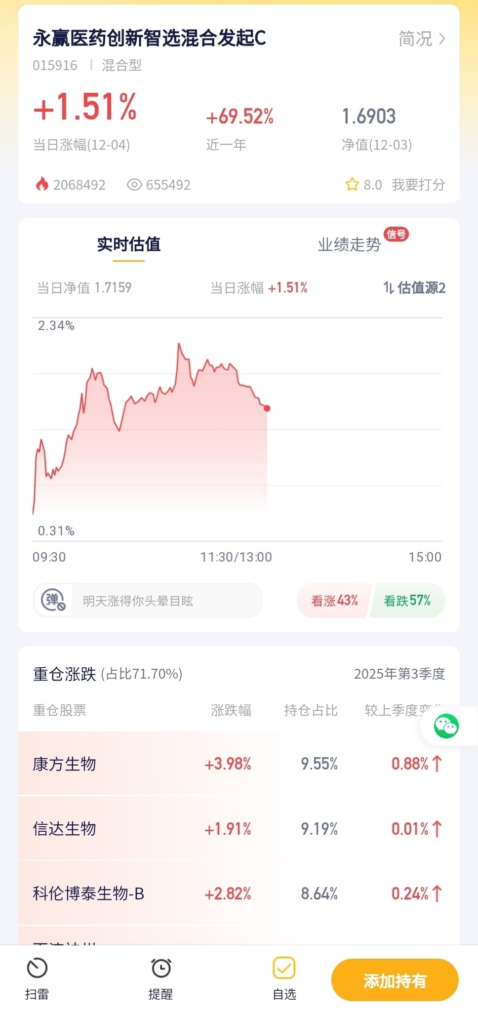 医药今天缓过来点了,创新药方向有资金关注,这基踩着节奏,今天总算能红一波~