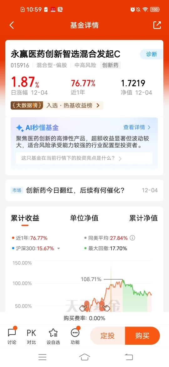 $永赢医药创新智选混合发起C$ 趁着这波调整后,慢慢布局起来,也是不错,聚焦港股+A股优质创新药,昨天涨幅1.87%,近六个月涨幅15.39%,近一年涨幅76.77%,把握两市医药创新领域的投资机会,抗风险能力强,最近AI医疗有热点催化,整体的估值也不是很高,所以机会依旧是很明显的!#华为将发布AI领域的突破性技术#