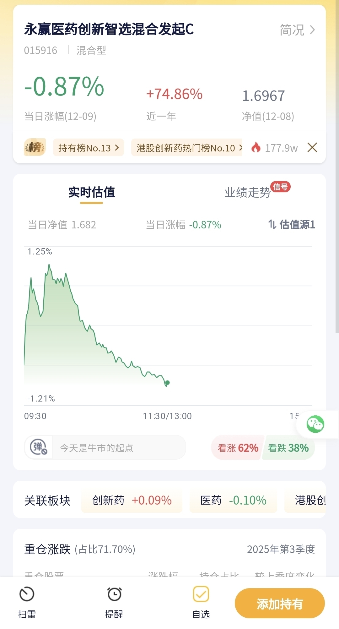 医药今天有点拉胯,这基跟着跌了小一个点,估计是板块情绪不太好,资金暂时撤了点。