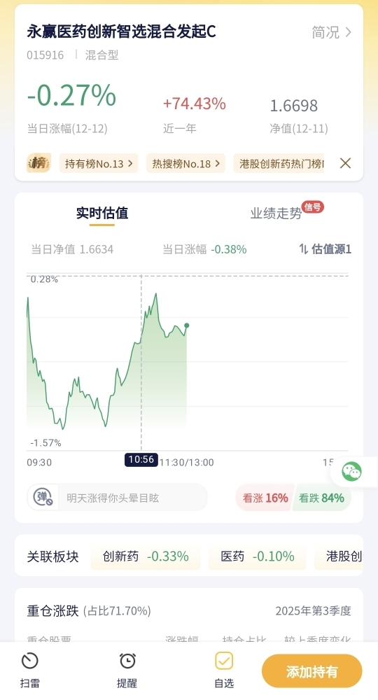 医药板块今天有点拉胯,这只医药创新基金也跟着跌了点,医药股今天受板块情绪影响,不少标的走弱,基金持仓的相关个股表现不佳,估值就跟着往下掉了点。