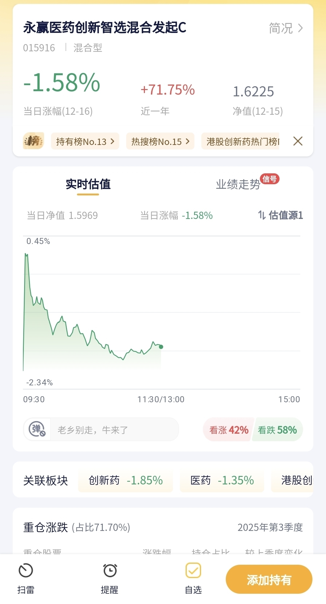 医药创新基今天跌了1.58%,医药板块今天整体表现低迷,创新药相关的个股走弱,这只基金重点布局医药创新领域,持仓标的受板块拖累,跌幅比半导体那只更明显些,医药板块短期还是偏弱势。