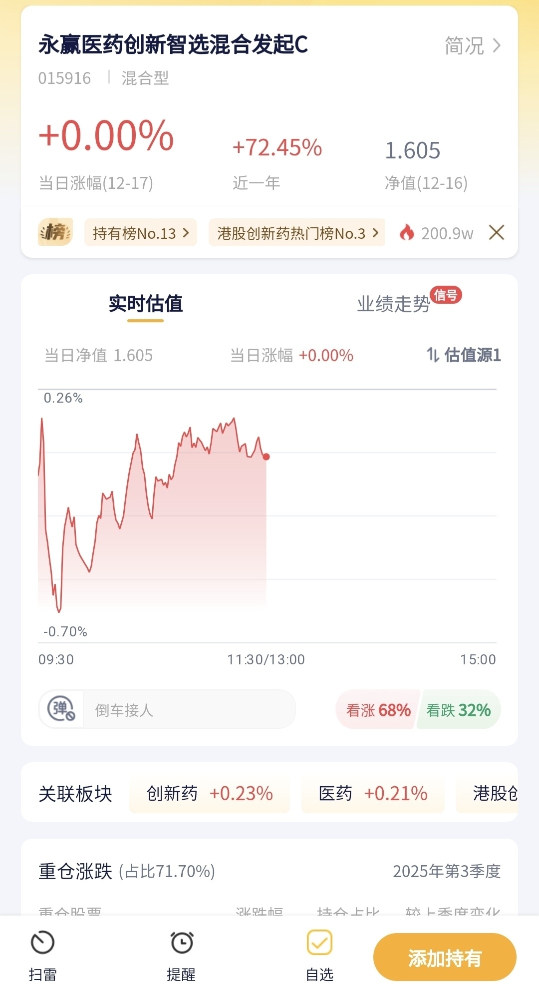 医药创新主题今天彻底走平,这只基金净值没涨没跌,板块内个股多在整理阶段,既没有强势拉升的标的,也没有大跌的个股,整体保持平稳。