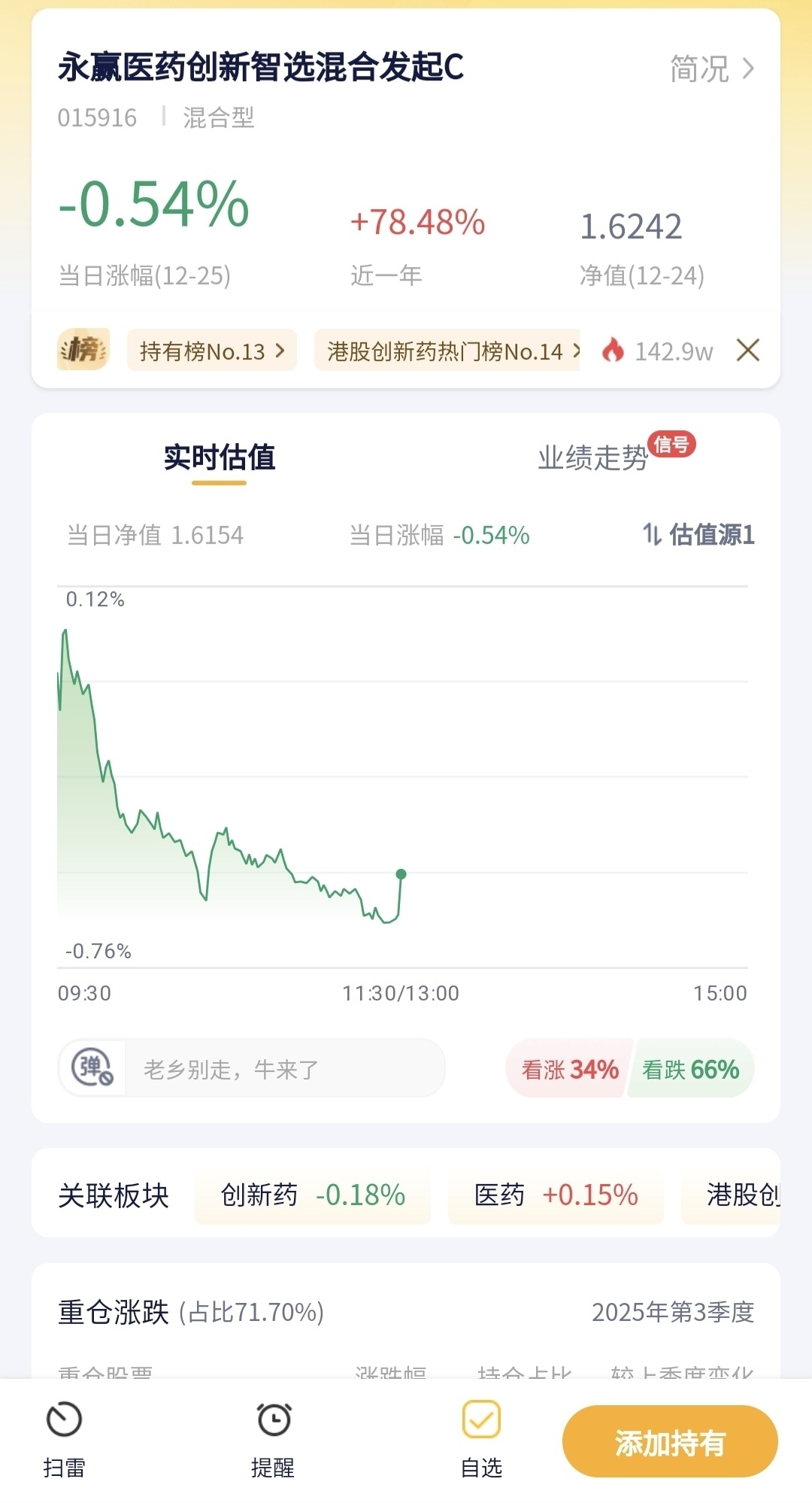 永赢医药创新这只基今天预估跌了0.54%,虽然绿了但跌幅不算大。医药板块今天整体没什么劲头,创新药相关个股既没利好消息撑着,还被部分资金小幅抛售,大家都把钱转到涨得好的先进制造、碳中和板块去了,这只医药主题基金自然就跟着走弱,好在跌得不算狠,暂时没什么大风险。