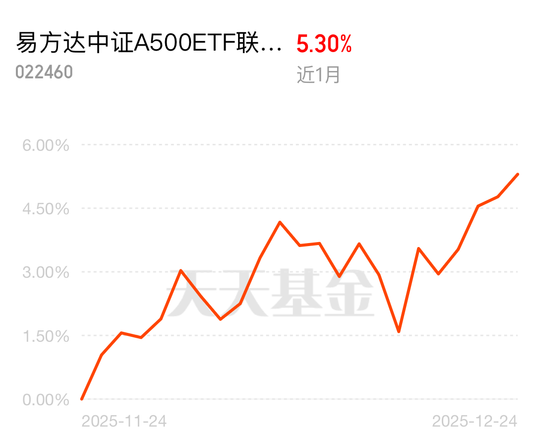 跨年行情预期升温,宽基指数基金需求涨,中证 A500 吸金不断。易方达中证 A500ETF 联接 C 近 1 月 5.30%,作为 ETF 的场外 “替代品”,紧密跟踪标的,1 元起投,小额资金也能参与。$易方达中证A500ETF联接C$
