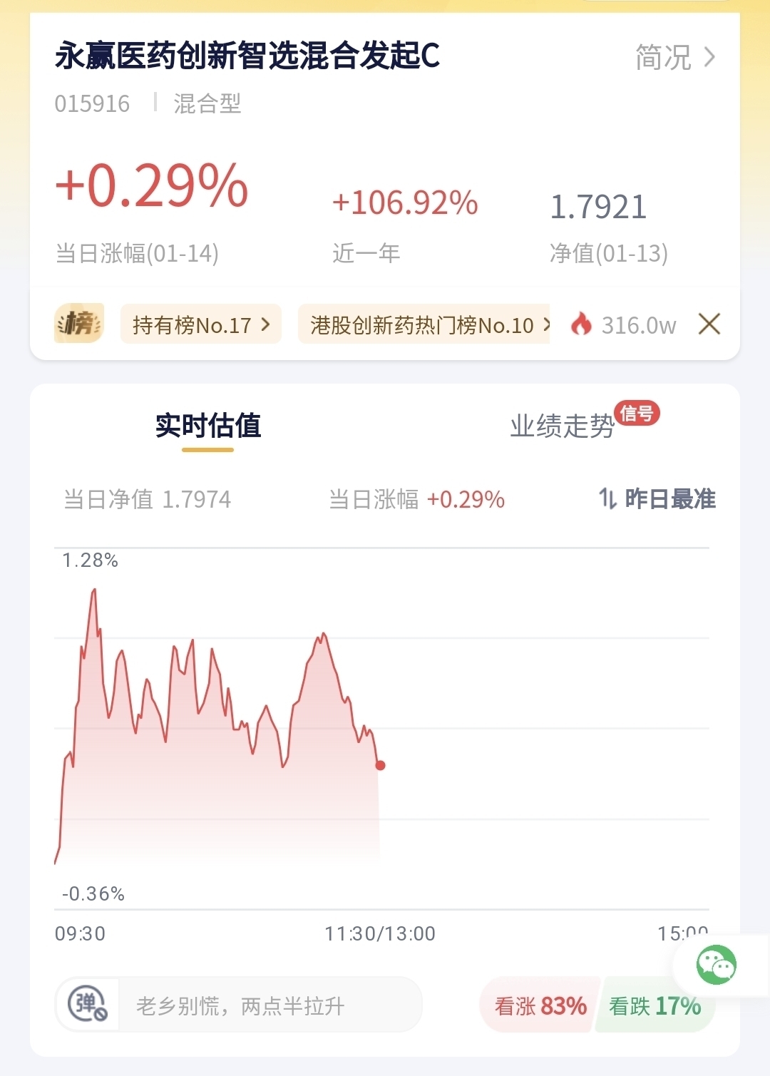 医药创新板块今天表现一般,永赢这只基金预估涨0.29%,涨幅比较微弱。医药板块近期一直是震荡走势,今天虽然没跌,但也只是跟着大市小幅度抬升。
