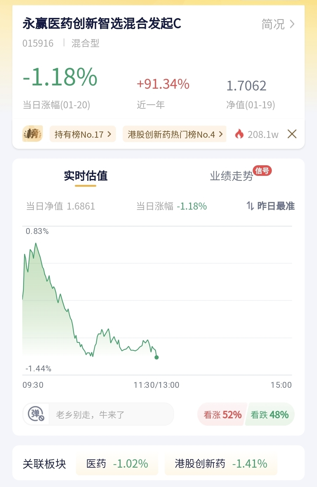 永赢医药创新智选混合发起C今日预估跌幅1.18%!