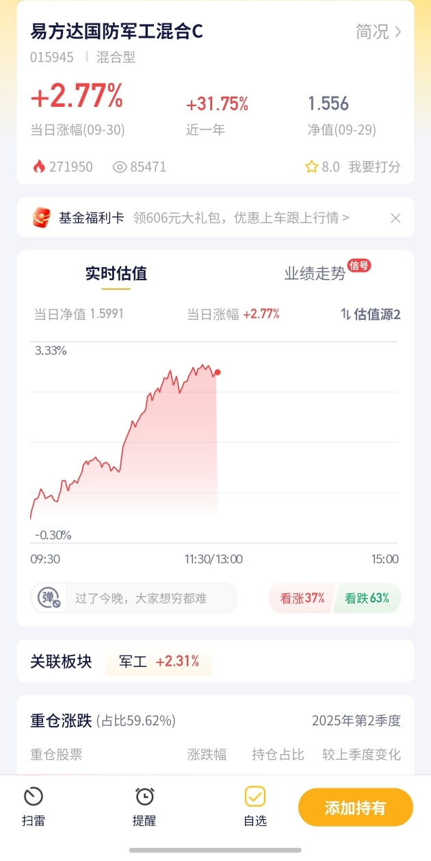 昨天涨0.58%,今天涨2.77%,军工板块今天集体爆发。这只基金也跟着吃肉了,看来选对板块很重要!