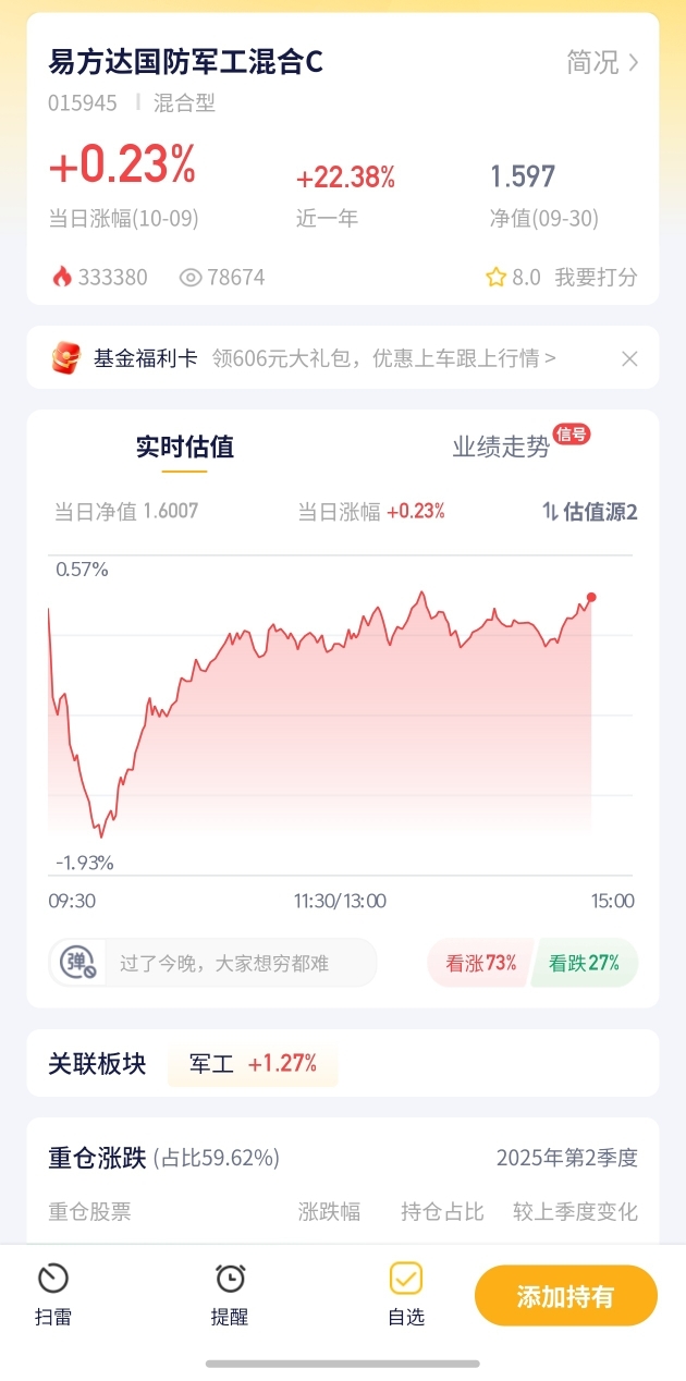 9. 易方达国防军工混合C:易方达的国防军工基金涨2.63%,估算涨0.18%,大基金公司的军工基,今天也跟着喝了口汤。