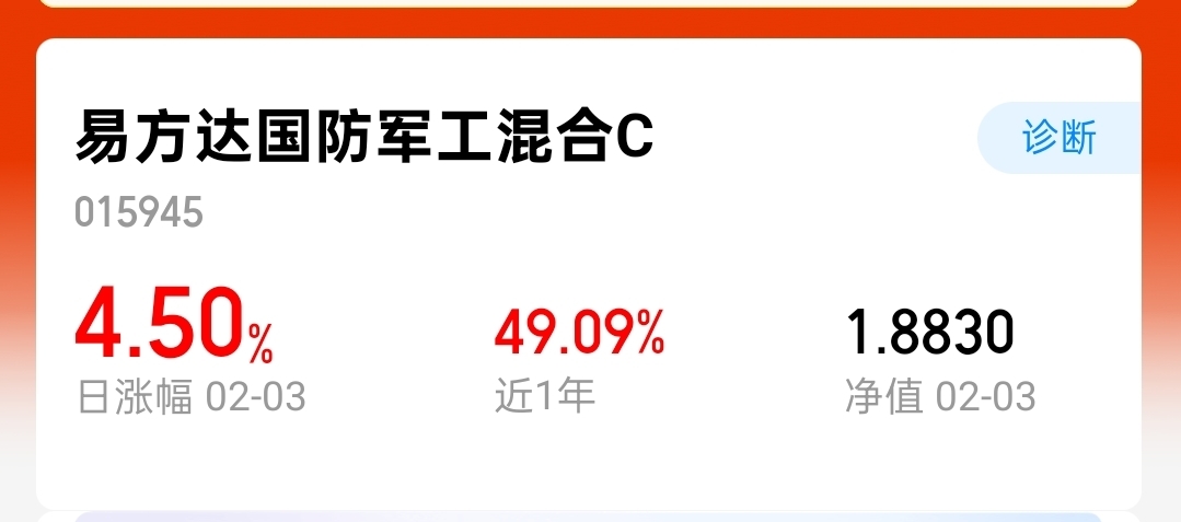 易方达国防军工C,涨4.5%,近一年涨幅近50%,持仓国防军工行业,覆盖航空航天、信息化、新材料等核心细分领域,2026继续走强,适合中长期持有,布局军工高景气赛道。