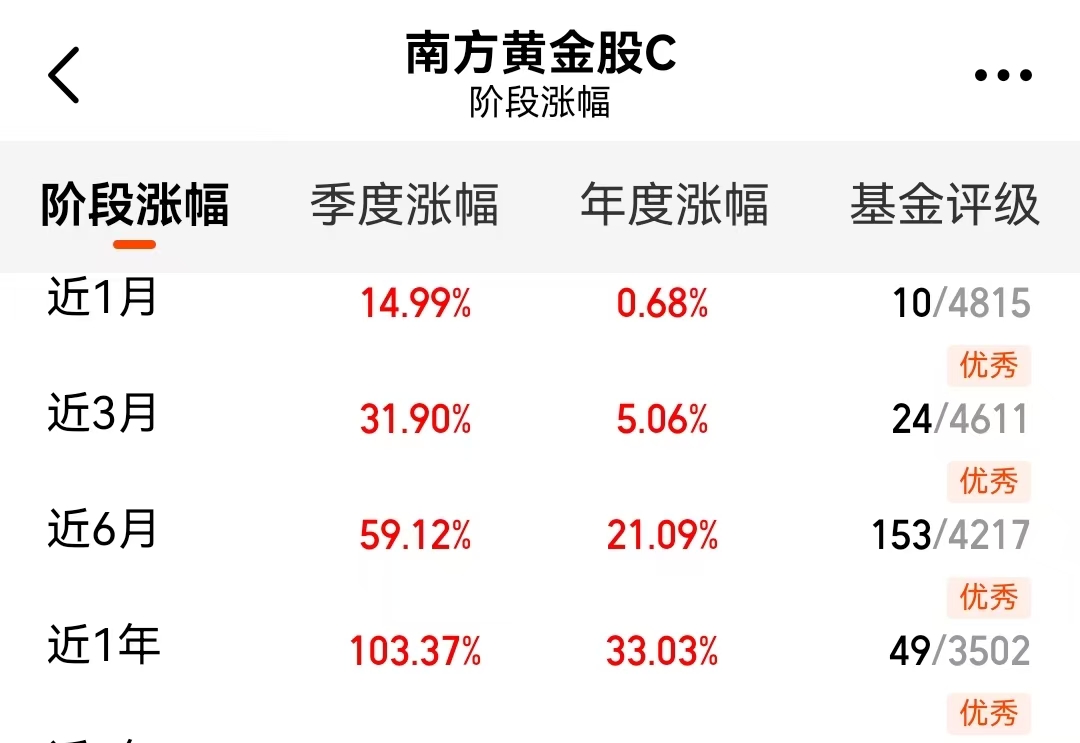 买黄金别光盯着实物金,那个波动小还占地方。这个$南方中证沪深港黄金产业股票指数发起A$(021958)专门投黄金产业链,金价涨的时候它往往涨得更猛。最近三个月它就涨了31%,弹性十足。而且管理费什么的都很透明,比直接买金条或者金饰的成本低多了。现在金价正好在反弹,正是入手的好时机。它的同类排名也很厉害,近一年也是第一。#暖阳创作计划#