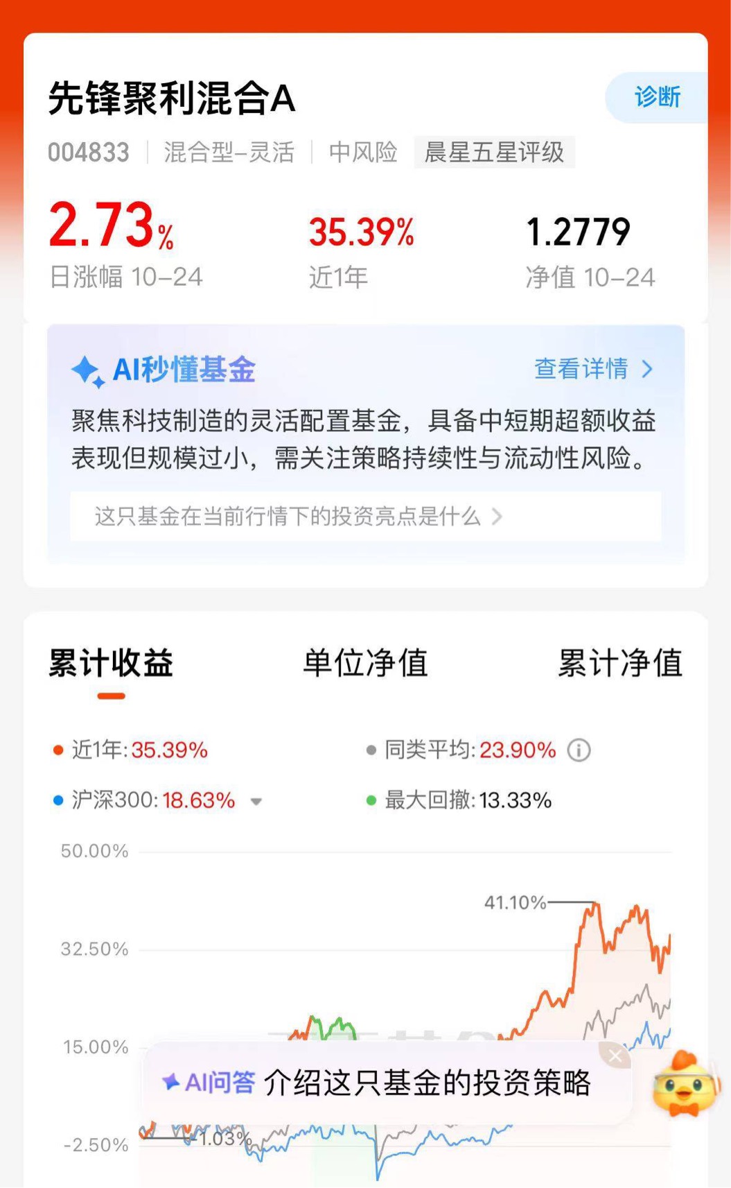 今天估值0.88%只是小试牛刀,先锋聚利混合A近三个月9.90%稳步推进,近六个月25.96%强势领跑,成立以来翻倍的基底撑起科技成长股标杆