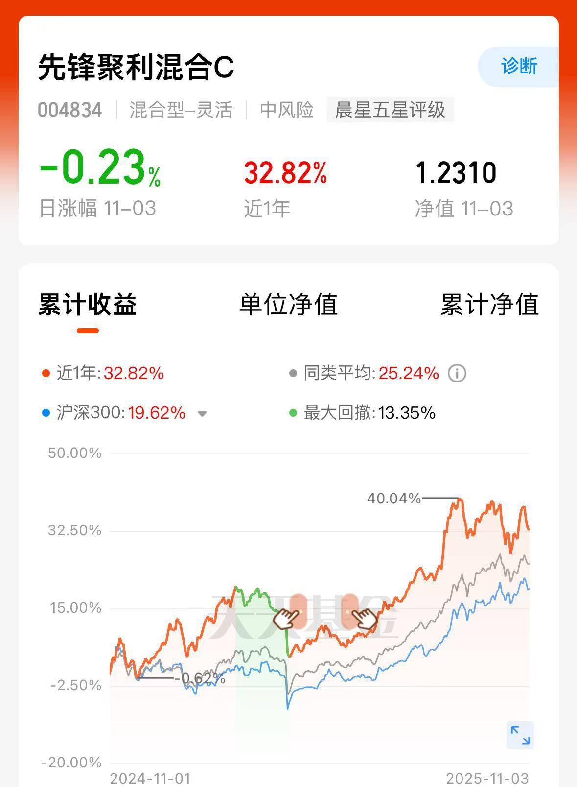 资金都在抢筹先锋聚利混合C,略微回调,今天正好有上车点的大阳线打头阵,近1年32