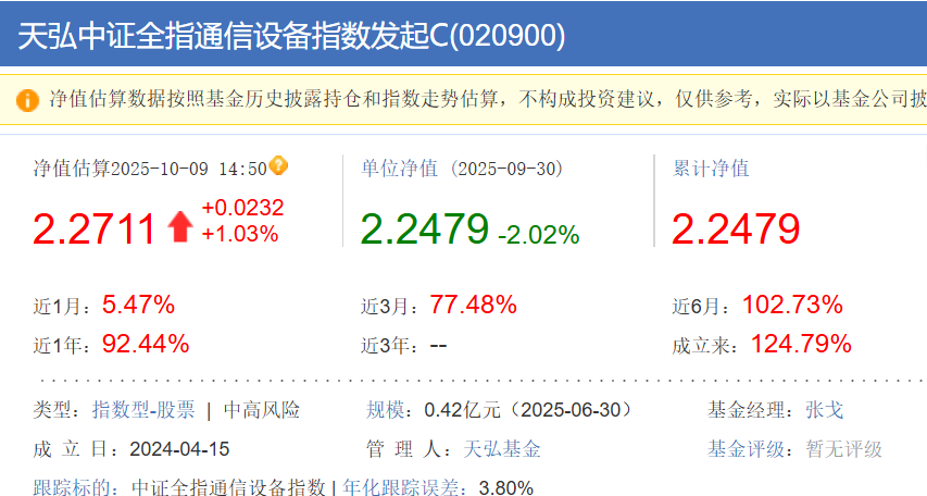 $天弘中证全指通信设备指数发起C$ 假期里面有个消息,很多朋友都担忧新易盛减持、海南华铁终止算力服务协议会对CPO板块造成冲击,事实证明小利空不改大趋势,当下AI依旧火热,长假期间,海外AI热点事件不断!算力CPO作为AI发展途中确定性较强的方向,今天也没让大家失望,中证全指通讯设备指数涨超1%,照这势头创新高也是早晚的事!指数爆发力强,近6月已实现翻倍大涨,看好CPO算力我也会继续出手布局。